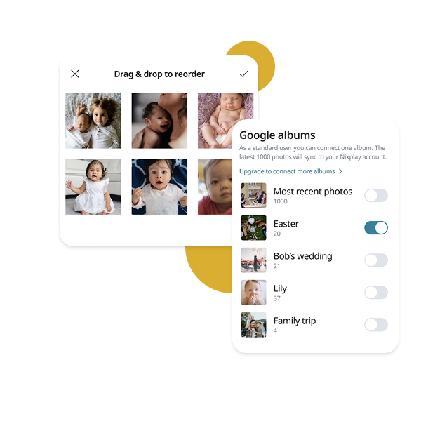 Le téléchargement de contenu sur Nixplay est simple et flexible à l’aide de nos applications mobiles et de bureau. Organisez vos photos et vidéos dans des albums privés, partagés ou d’événements, puis connectez-vous à des albums Dropbox et Google existants.